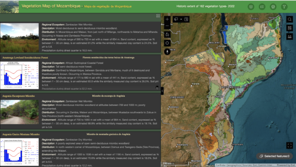 Entre 2019 e 2023 foi desenvolvido o mapa histórico dos ecossistemas de Moçambique que identificou 162 unidades de vegetação a uma escala 1:250.000. Foi também realizada a primeira avaliação nacional da Lista Vermelha de Ecossistemas de acordo com a metodologia da UICN. O relatório encontra-se acessível no botão abaixo (Lötter, M., Burrows, J., Jones, K., Duarte, E., Costa, H., McCleland, W., Stalmans, M., Schmidt, E, Darbyshire,I., Richards, S., Soares, M., Grantham, H., Matimele, H. Sousa, C., Alves, T., Zolho, R., Nicolau, D., Ribeiro,N., Macamo, C., Massingue, A., & Bandeira S. 2023. Mapa histórico de vegetação e avaliação da lista vermelha de ecossistemas de Moçambique – Versão 2.0 – Relatório final. USAID / SPEED+, AFD/FFEM. Maputo. 494pp).
