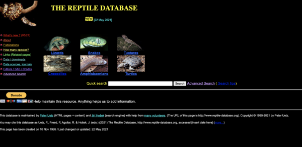 Base de dados que fornece um catálogo de todas as espécies de répteis existentes na terra e a sua classificação. Actualmente com mais de 10.000 espécies, incluindo outras...